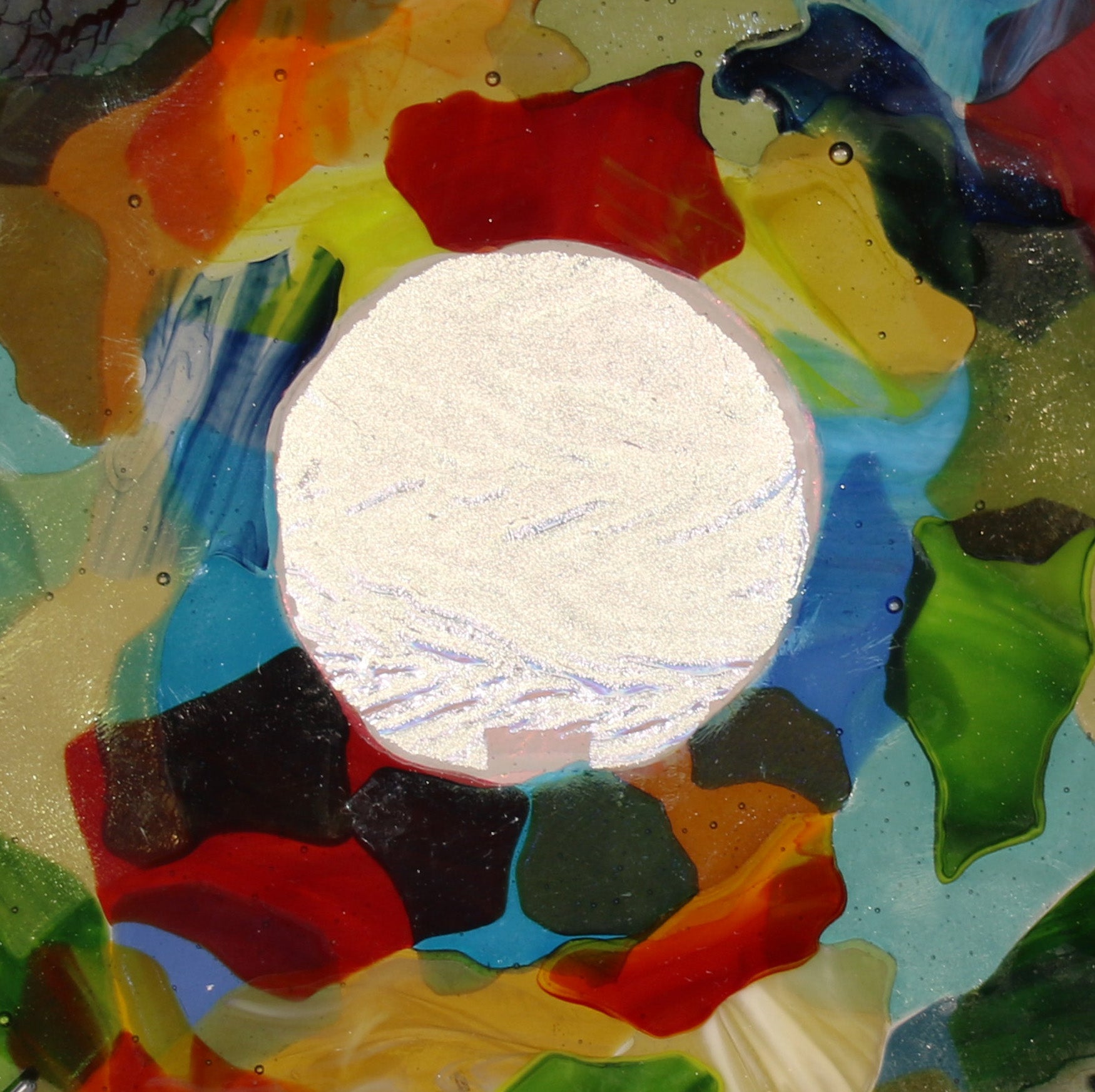 12" circle covered with many pieces of colorful fused glass surrounding a dichroic center.