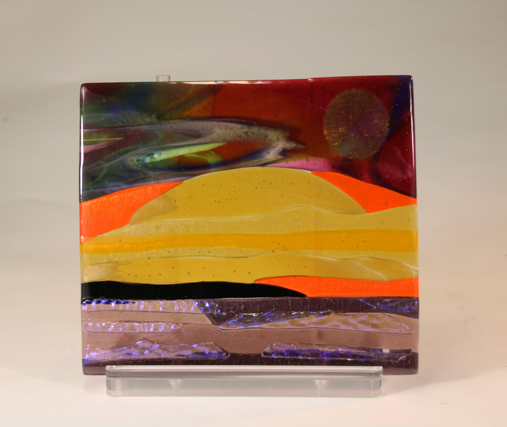 Fused glass panel made from different types of glass: dichroic, streaky, and irridized