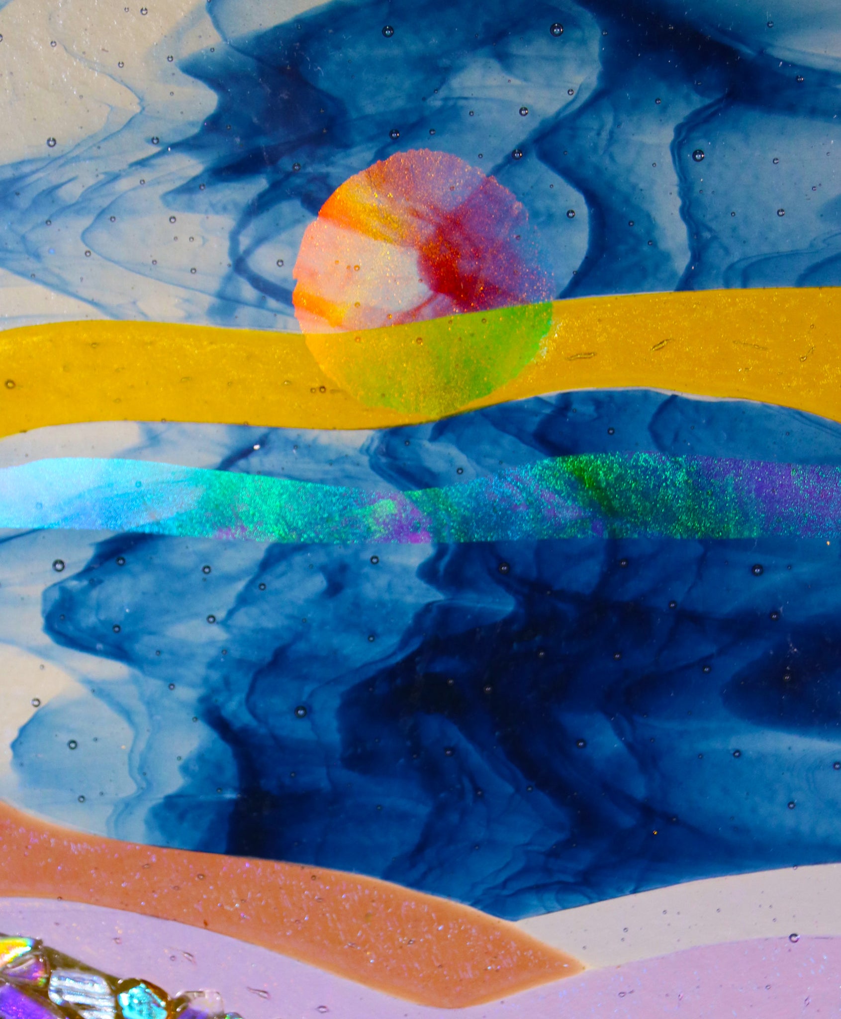 Made with two firings that consists of forming the background with different colors of glass that is capped with clear glass and decorated with dichroic elements