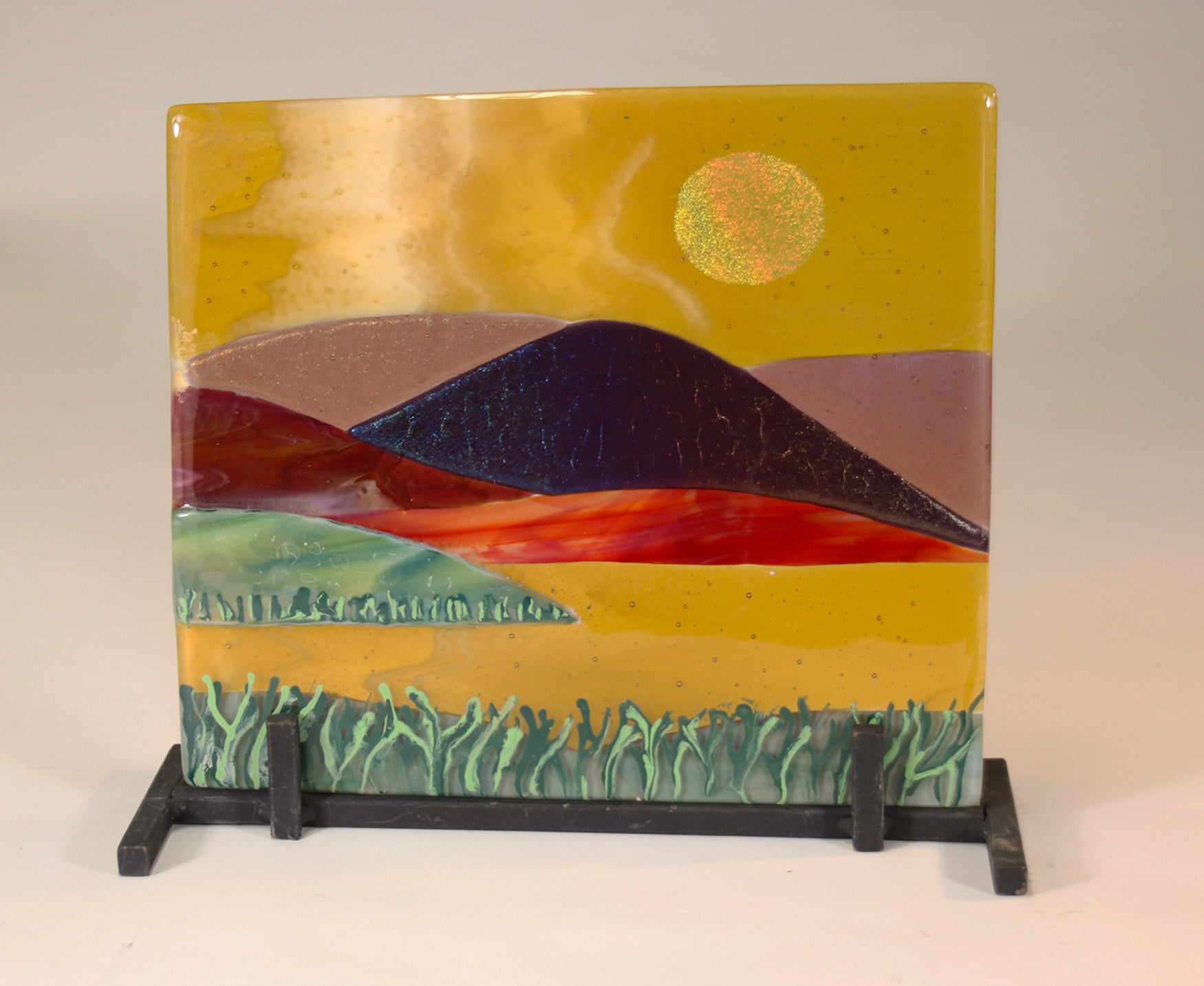 Made with one firing that consists of forming the background with different colors of glass that is capped with clear glass and  fused to a flat sheet.    Embellished with dichroic glass and enamel